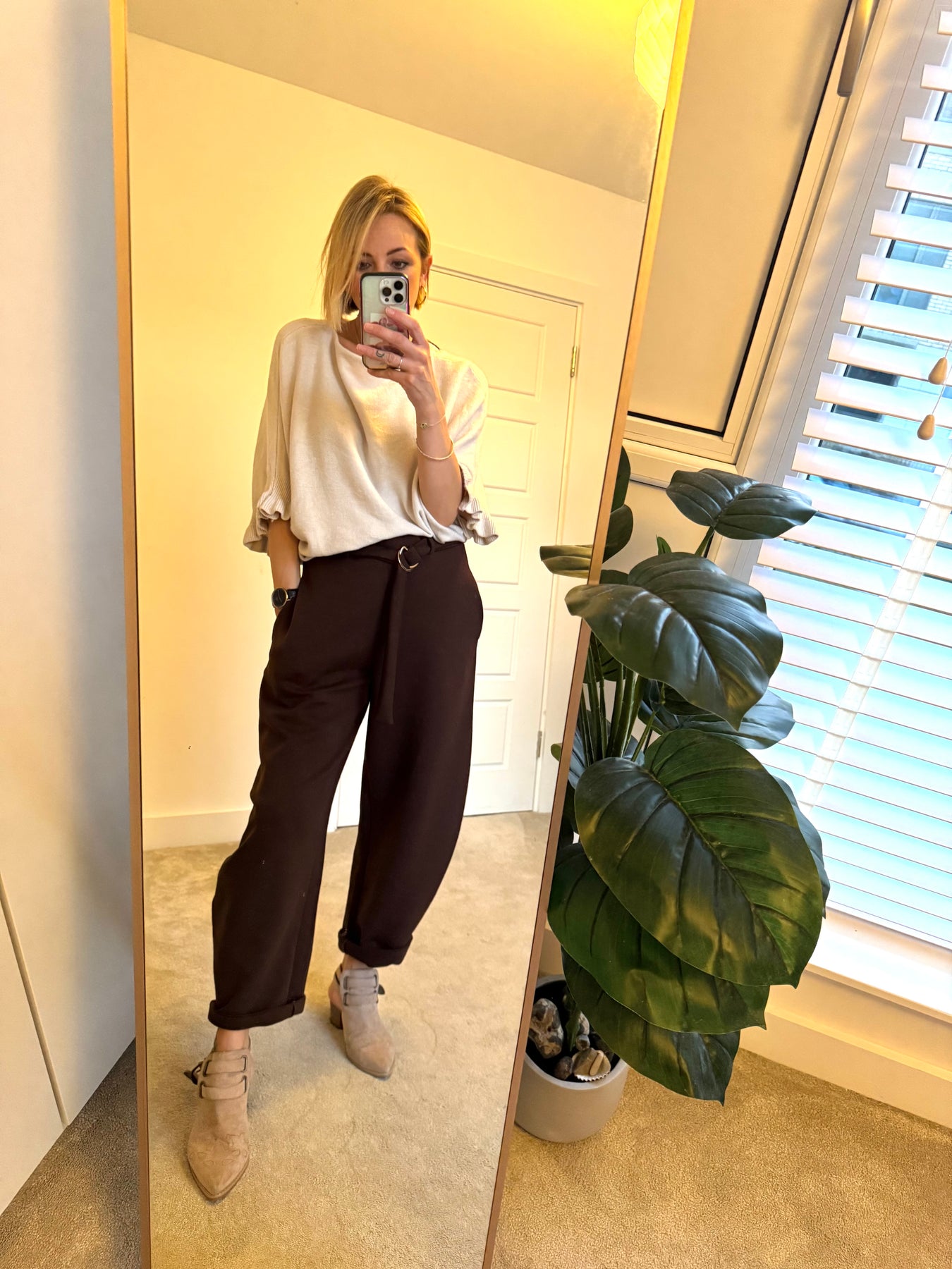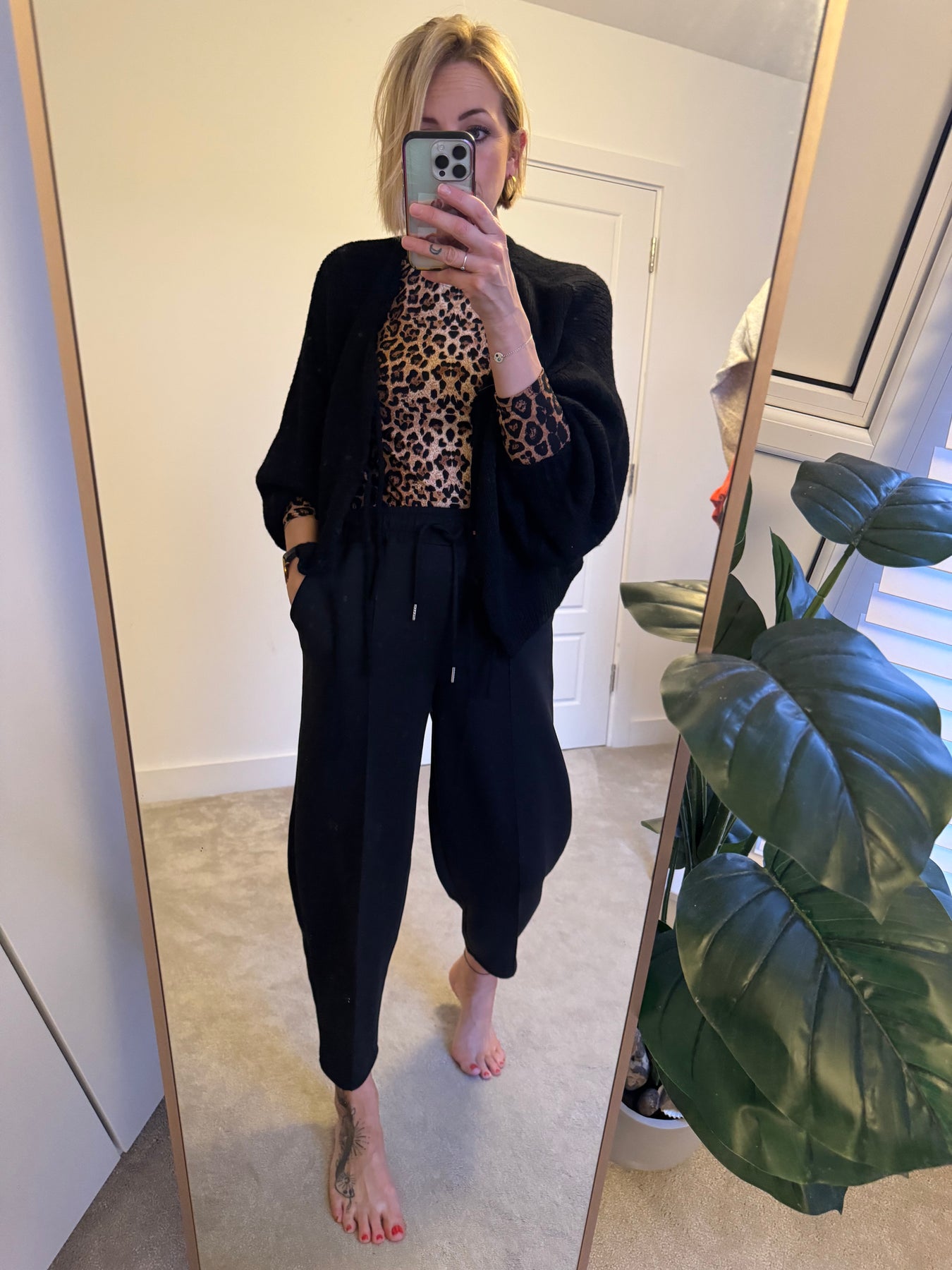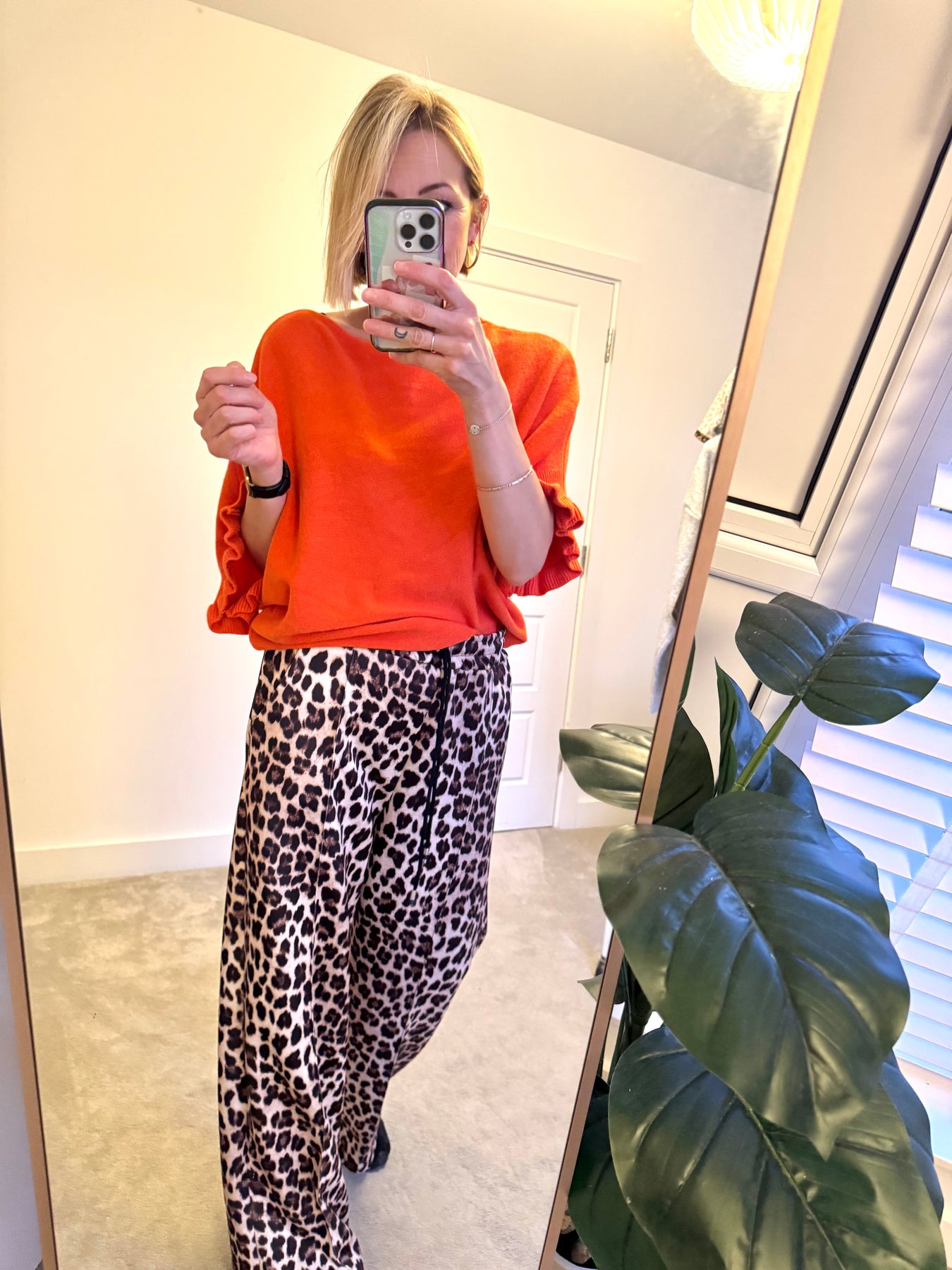 Featuring 3 ties to the front and a slight balloon sleeve, it works great with the ballon pants and a cami, or with the wide leg leopard print trousers.