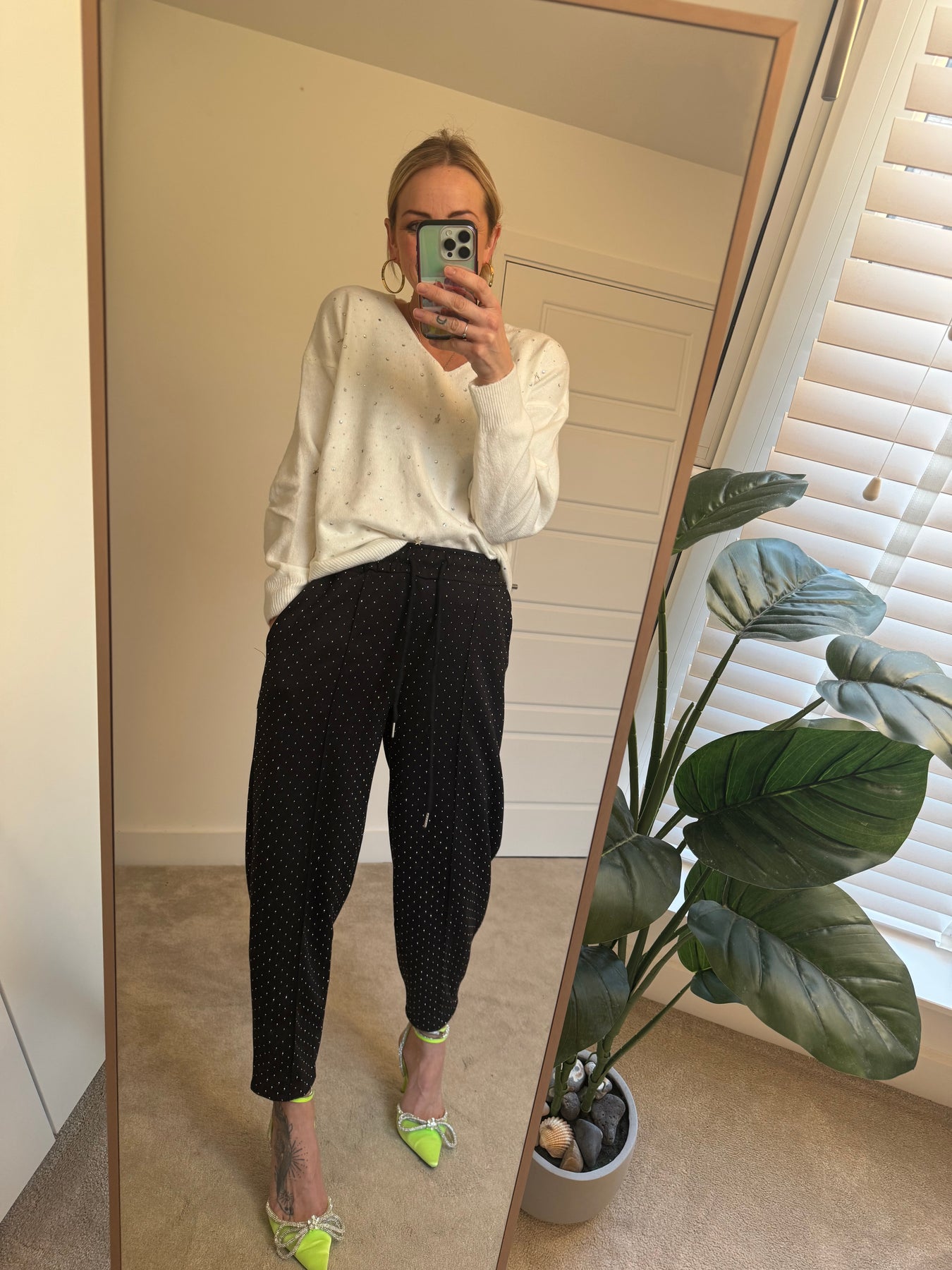Try wearing this v-neck fine knit jumper with the embellished joggers or wide leg trousers.