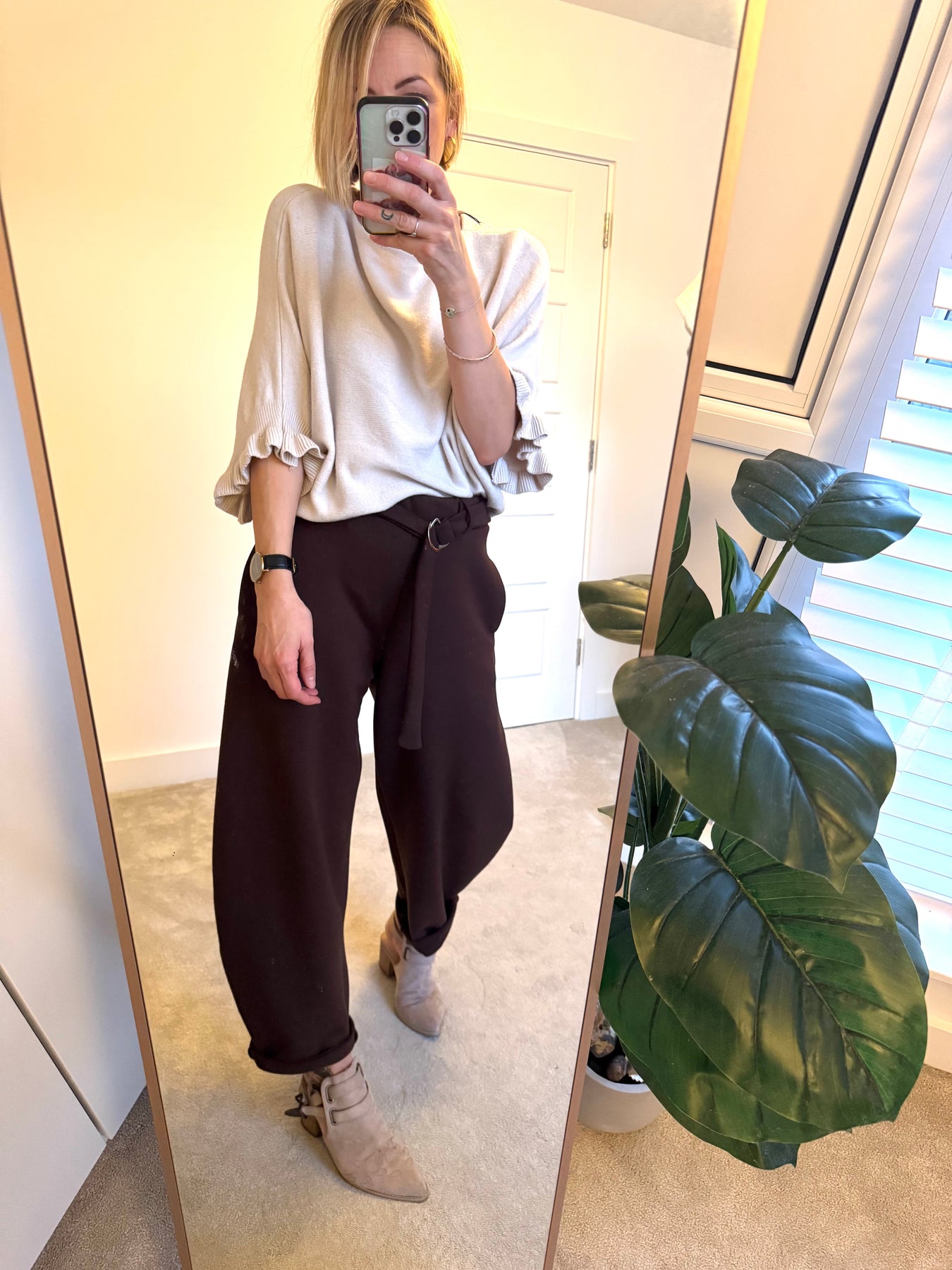 Stylish and a great base colour to mix with new spring brights , style this soft knit v neck and back jumper with the carrrot joggers for a relaxed day to day outfit .
