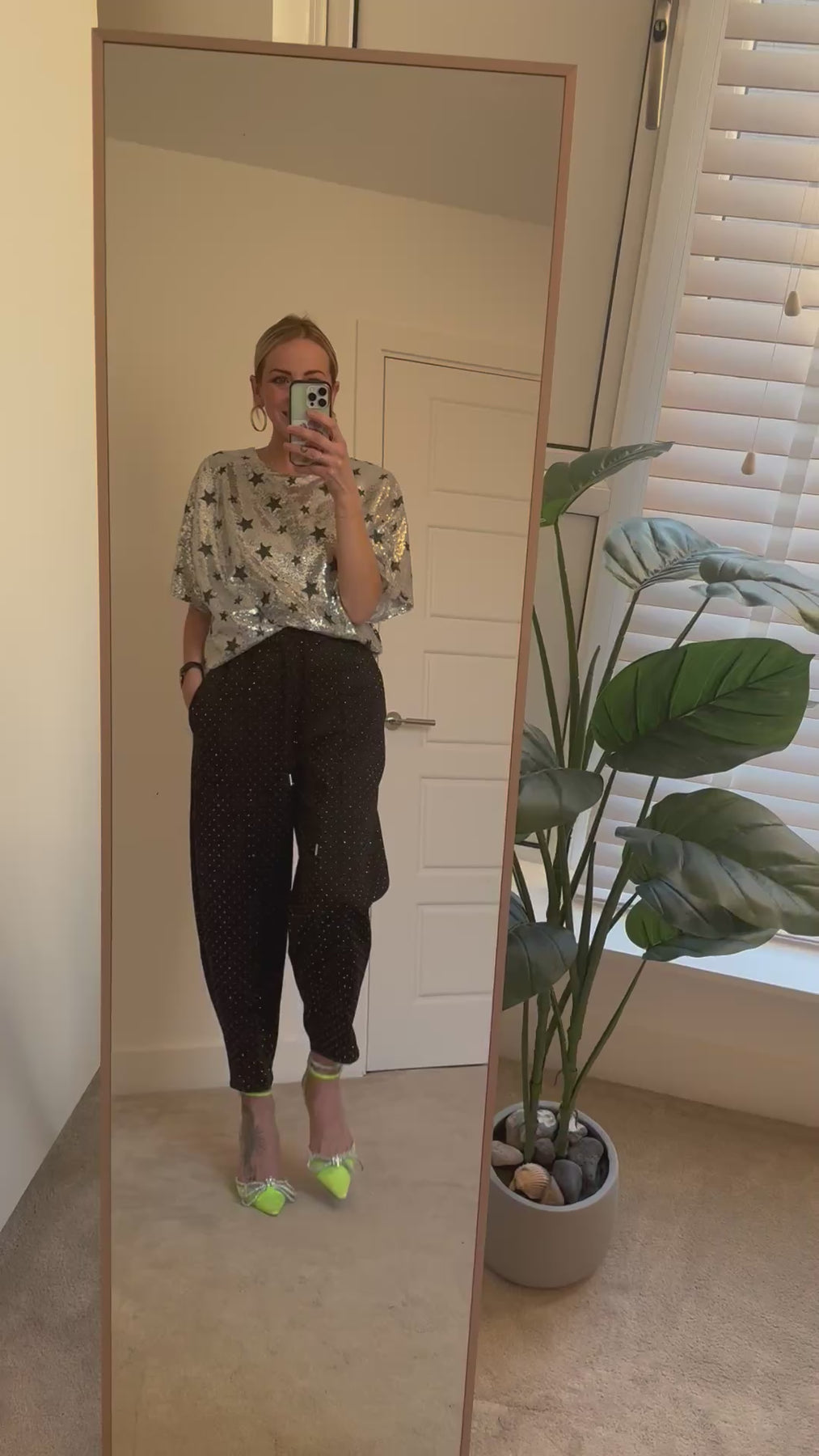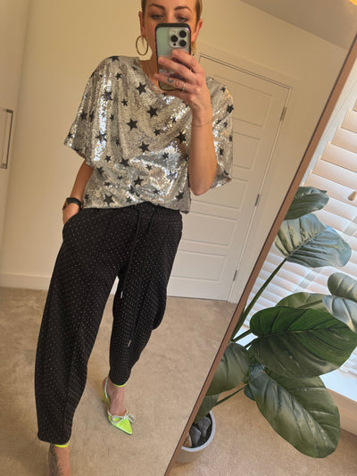 Featuring black stars on a silver base, this fully lined round neck tee is great to really dress up with the sparkle joggers, or keep more casual with a wide leg trouser or balloon jean.